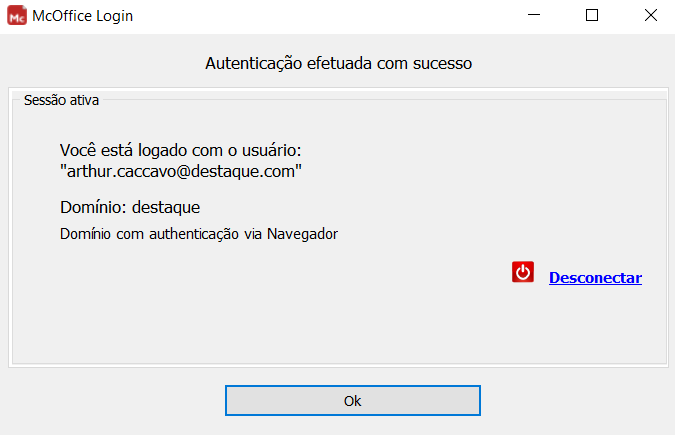 5. Pronto! Você está logado no McFile e com tudo certo para usar seu McOffice :) Viocê pode verificar o status de login clicando novamente em login e vendo a seguinte mensagem:
