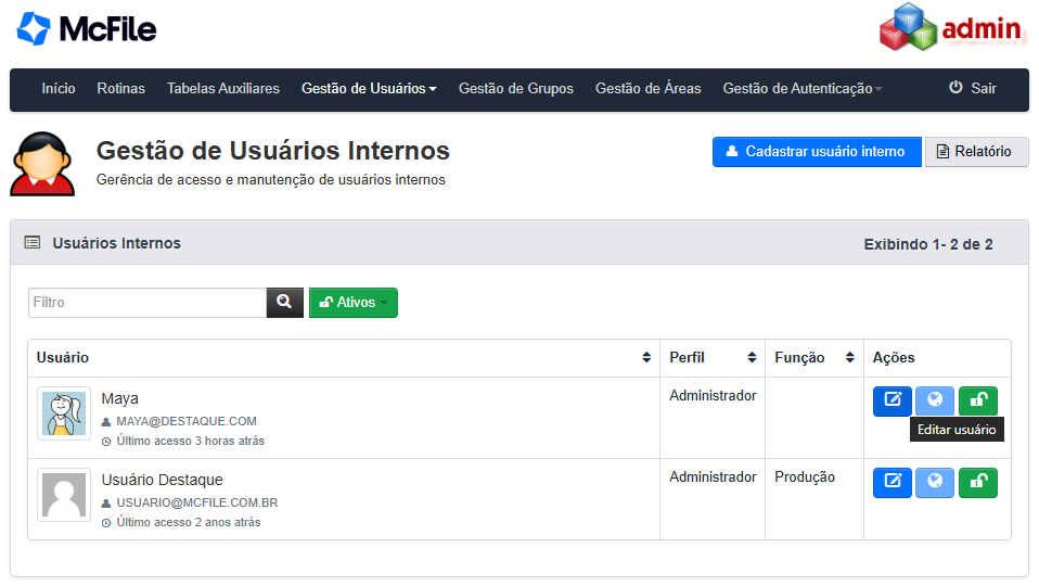 4. Localize o usuário que receberá a chave e clique no botão de edição (ou cadastre um novo usuário).