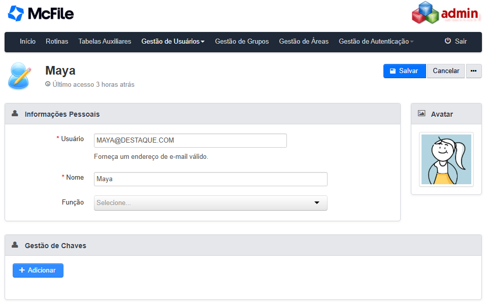 5. Na ficha do usuário, navegue até a seção Gestão de Chaves e clique em Adicionar.