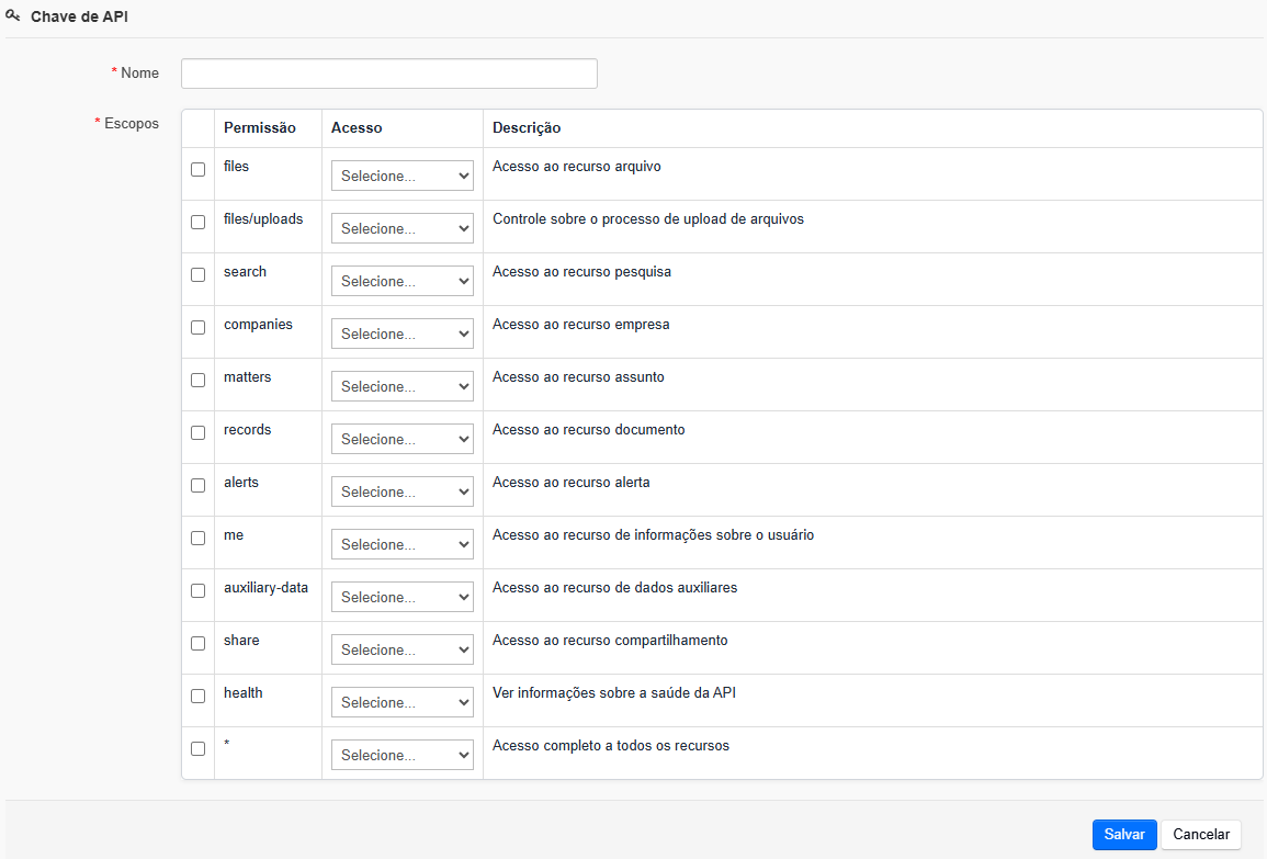 6. Atribua um nome para a chave e selecione os Escopos necessários, definindo o nível de acesso para cada um deles.