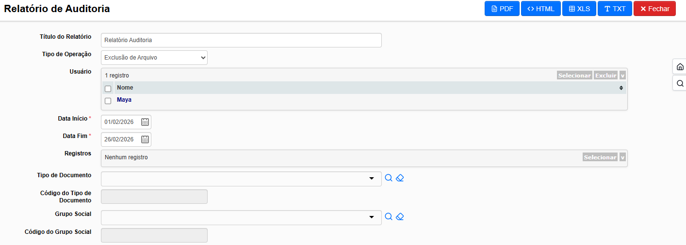4. Clique no botão correspondente ao formato de sua preferência (PDF, HTML, XLS ou TXT), localizado na parte superior da tela, para gerar e baixar o relatório final.
