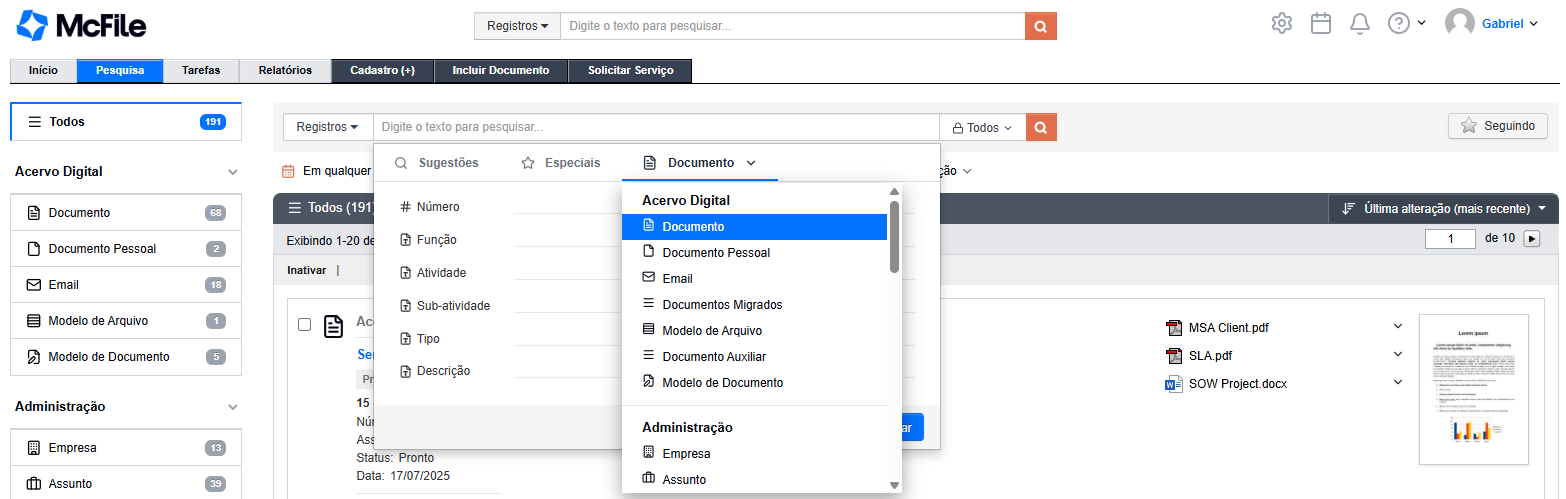 1. Clique na barra de pesquisa e escolha o tipo de registro em que deseja realizar a busca clicando na seta ao lado do nome. O tipo Documento já vem selecionado por padrão.