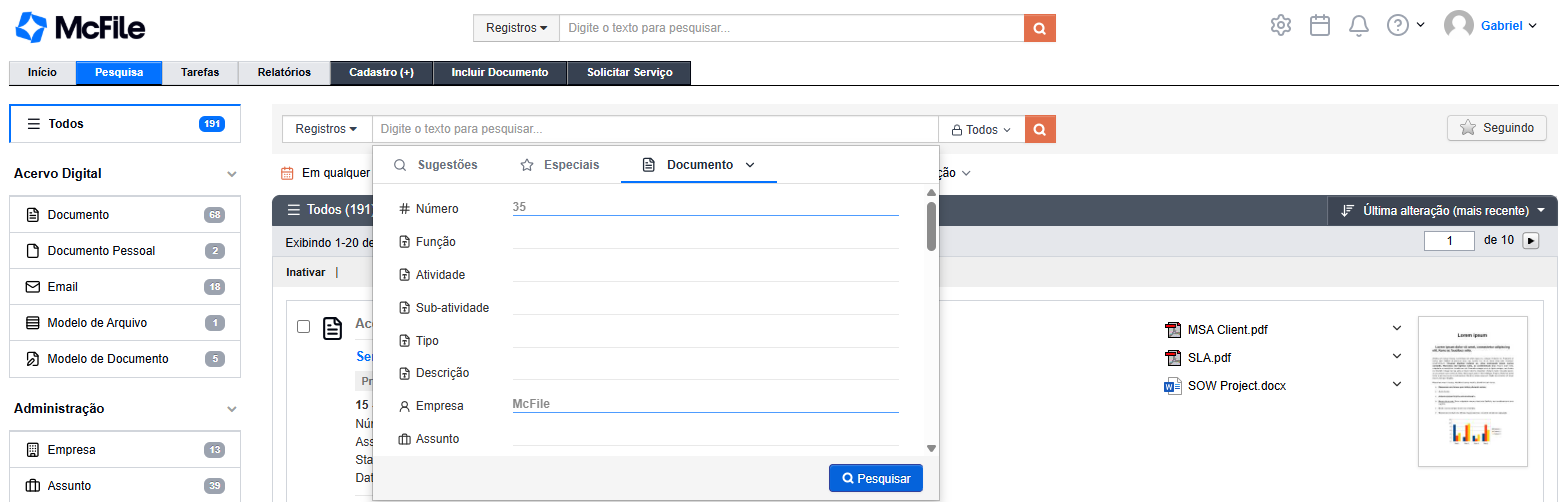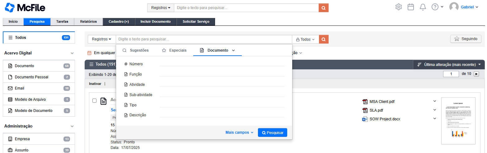 Se você precisa de um resultado mais certeiro, pode escolher em qual campo do sistema a palavra deve ser buscada (como número de um contrato, ou no nome de um cliente).