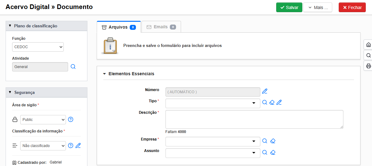 2. Uma nova aba será aberta no seu navegador com o formulário de cadastro. Preencha os campos da ficha com os dados do Documento.