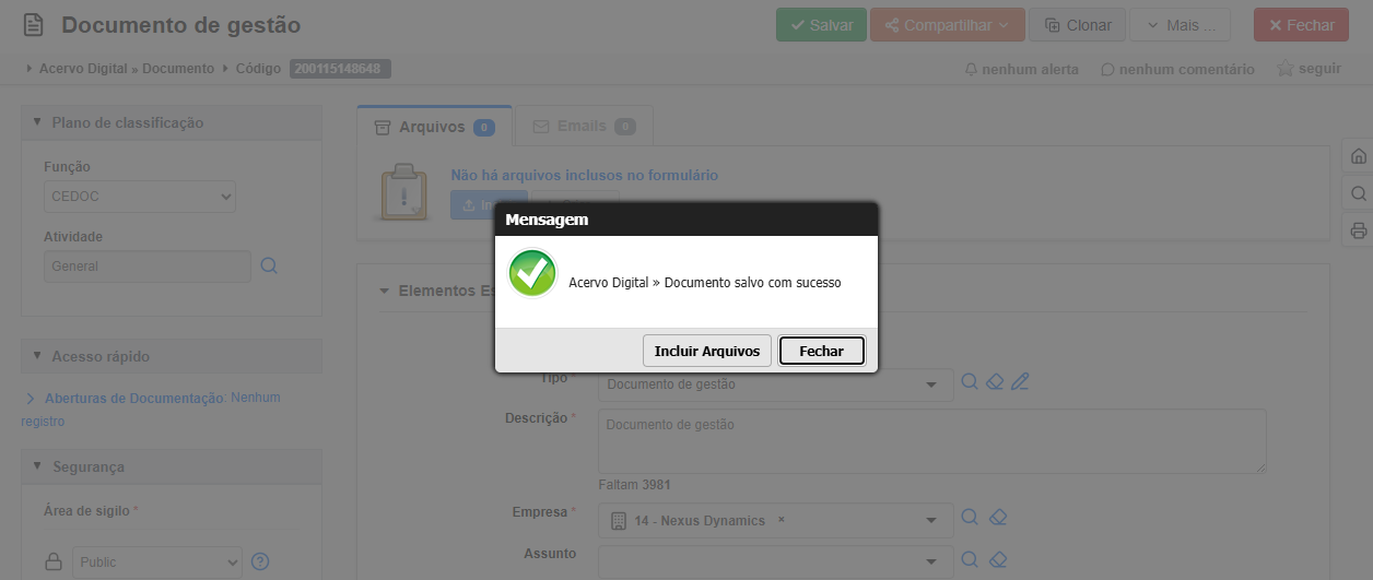 Ao Salvar, será possível incluir arquivos no Documento cadastrado.