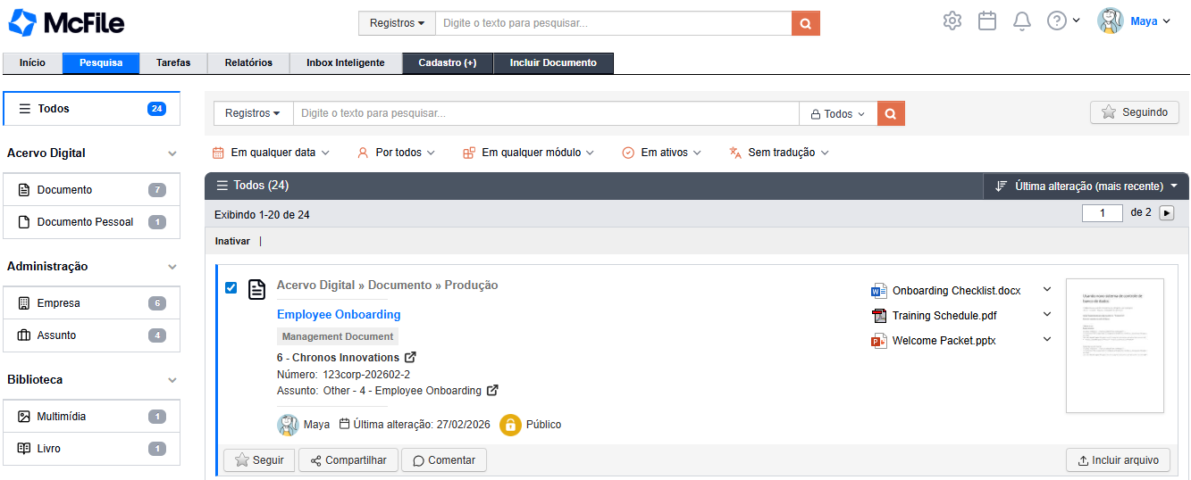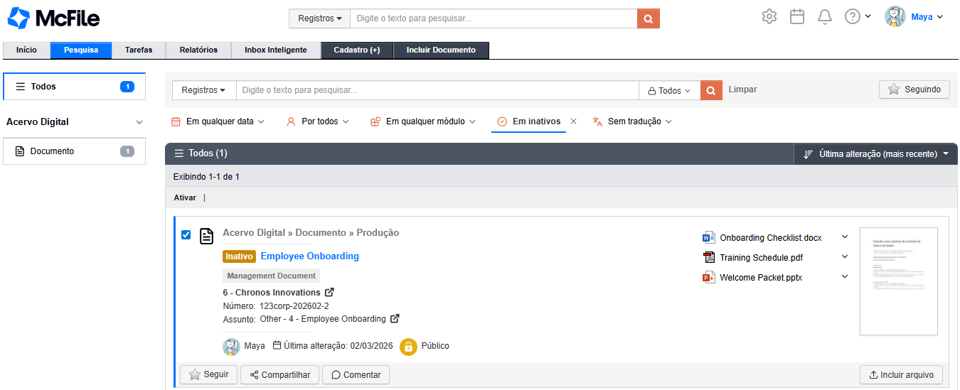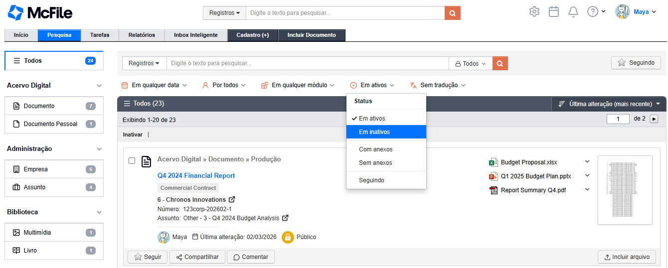 Gerenciar a disponibilidade de registros na plataforma é essencial para manter sua base de dados organizada e atualizada. A McFile permite que você altere o status de um documentos sempre que necessário, garantindo que apenas os itens relevantes estejam visíveis para uso imediato.